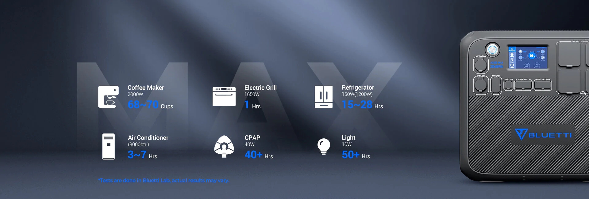 Der AC200MAX erlaubt bis zu 900W Solareingang und 500W über den Adapter, Sie können ihn sogar über Ihre Steckdose und Solarmodule gleichzeitig aufladen, was eine atemberaubende Gesamtladerate von 1400W ergibt, mit der Sie Ihr Power-Biest in weniger als zwei Stunden aufladen können! Darüber hinaus verfügt jedes BLUETTI-Batteriemodul über einen eigenen Eingang für AC-Adapter, so dass Sie mit jedem weiteren Modul eine zusätzliche Eingangsleistung von 500 W erhalten (bis zu zwei für den AC200MAX).