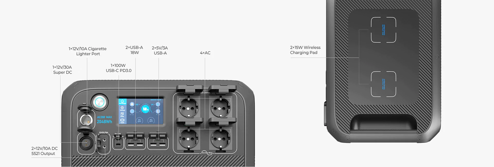 DC-Ausgang: 1*12V/30A Super DC, 1*12V Zigarettenanzünder-Anschluss, 2*12V DC 5521 (5,5mm Steckdose)