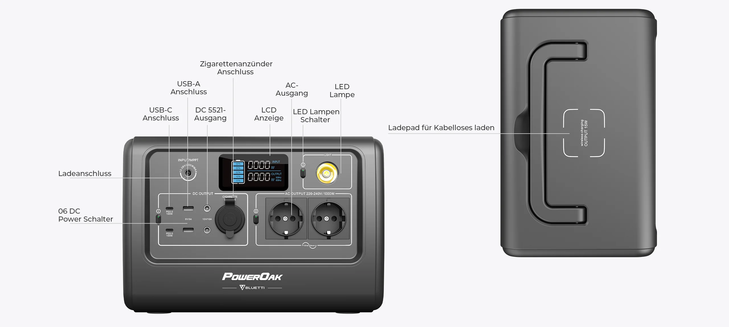 10 Ausgangsanschlüsse erfüllen Ihre Anforderungen zum gleichzeitigen Laden verschiedener Geräte. Ein drahtloses 15-Watt-Ladepad an der Oberseite erleichtert das Aufladen von Mobiltelefonen erheblich. Von Mini-Kühlschränken bis hin zu LED-Leuchten ist es eine großartige Aufbewahrungsoption für Camping und Notfälle.